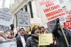 Dozens of protesters blocked the entrance of the New York Stock Exchange, with some later being arrested, to protest the tax overhaul bill on Dec. 19, 2017. The bill was headed to a vote the same day.